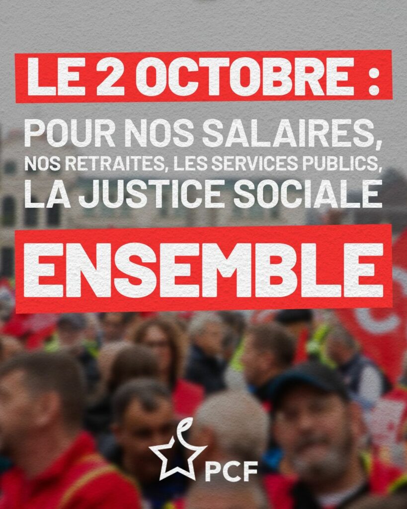 Le PCF soutient donc l'appel de l'intersyndicale et appelle les travailleurs et travailleuses, l'ensemble de nos concitoyens à y répondre en se mobilisant massivement lors d'une nouvelle journée de grèves et de manifestations le jeudi 2 octobre.